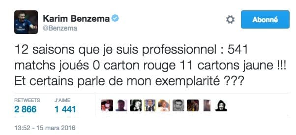 Une sortie qui a déclenché la colère du principal intéressé qui n’a pas manqué de répondre sur son compte Twitter : “Douze saisons que je suis professionnel : 541 matchs joués, 0 carton rouge 11 cartons jaunes !!! Et certains parlent de mon exemplarité ?”