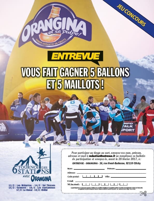 À l’occasion du Tournoi des 6 stations, qui se tient du 13 au 19 février, Entrevue s’associe à Orangina et vous fait gagner 5 ballons et 5 maillots officiels du tournoi.